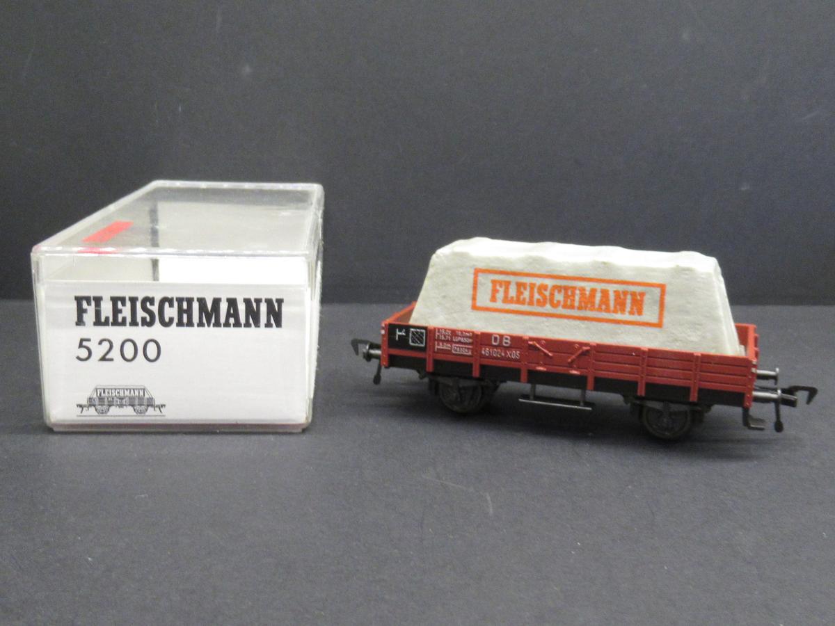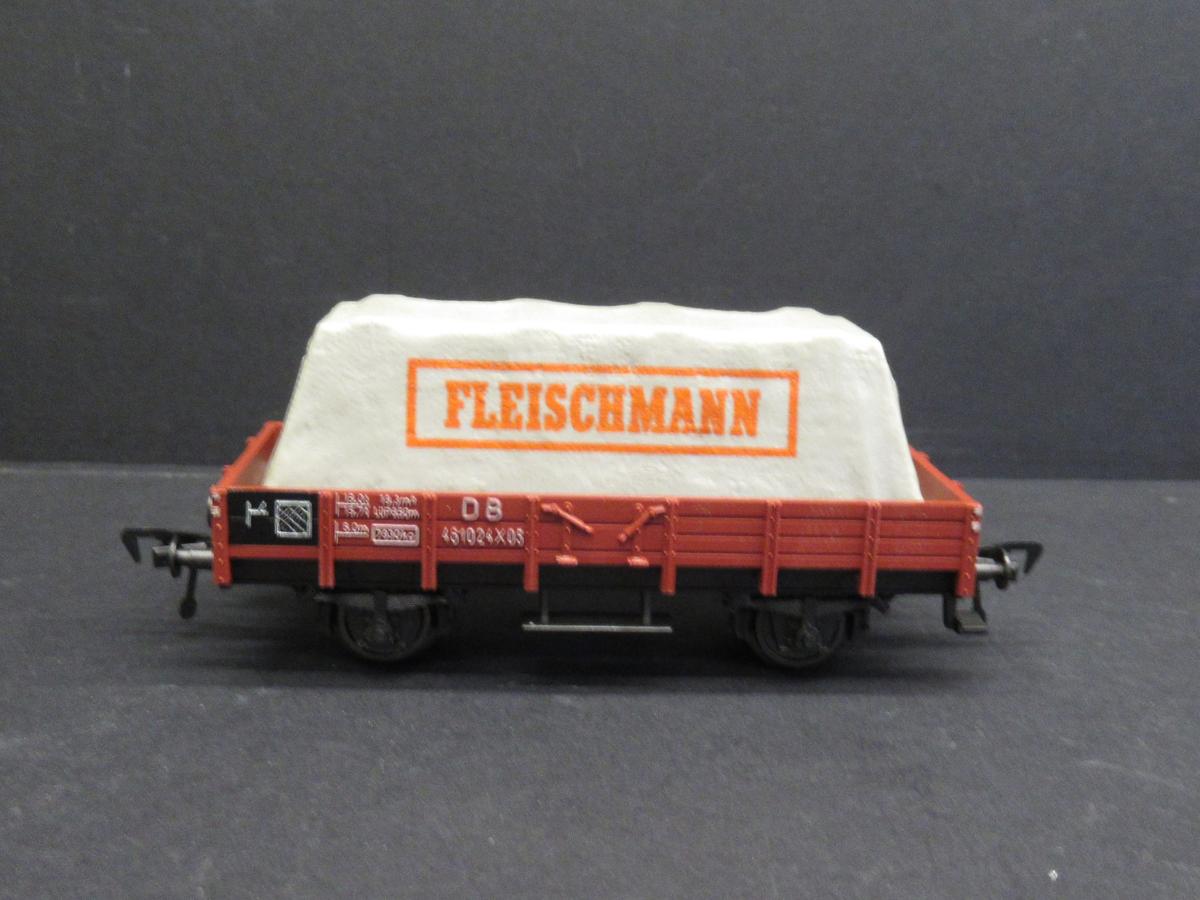 2-achsiger Niederbordwagen der DB mit Plane mit der Beschriftung Fleischmann.